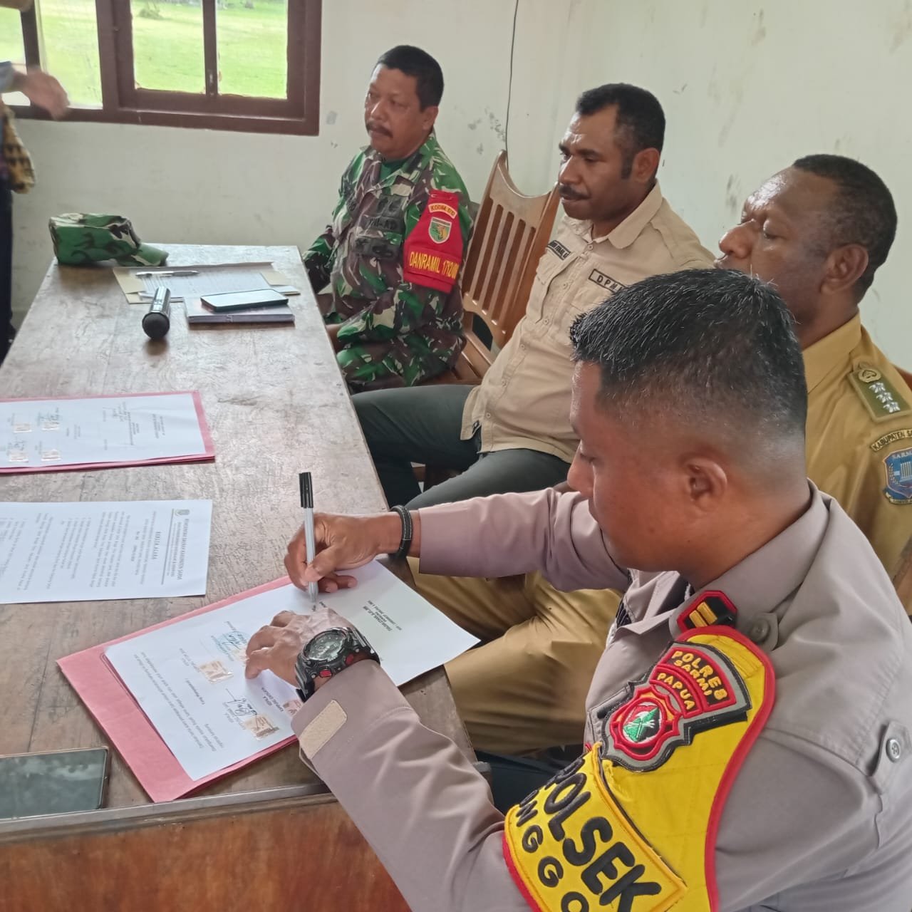 Sarmi – Kapolsek Bonggo IPTU Yustus Maudul, S.E., M.Si., menghadiri kegiatan penyelesaian dokumen penetapan batas-batas (peta) administrasi Kampung Tarawasih Marenggi, Distrik Bonggo Timur, yang dilaksanakan pada Kamis (26/2/2026) bertempat di Aula Kantor Distrik Bonggo Timur.