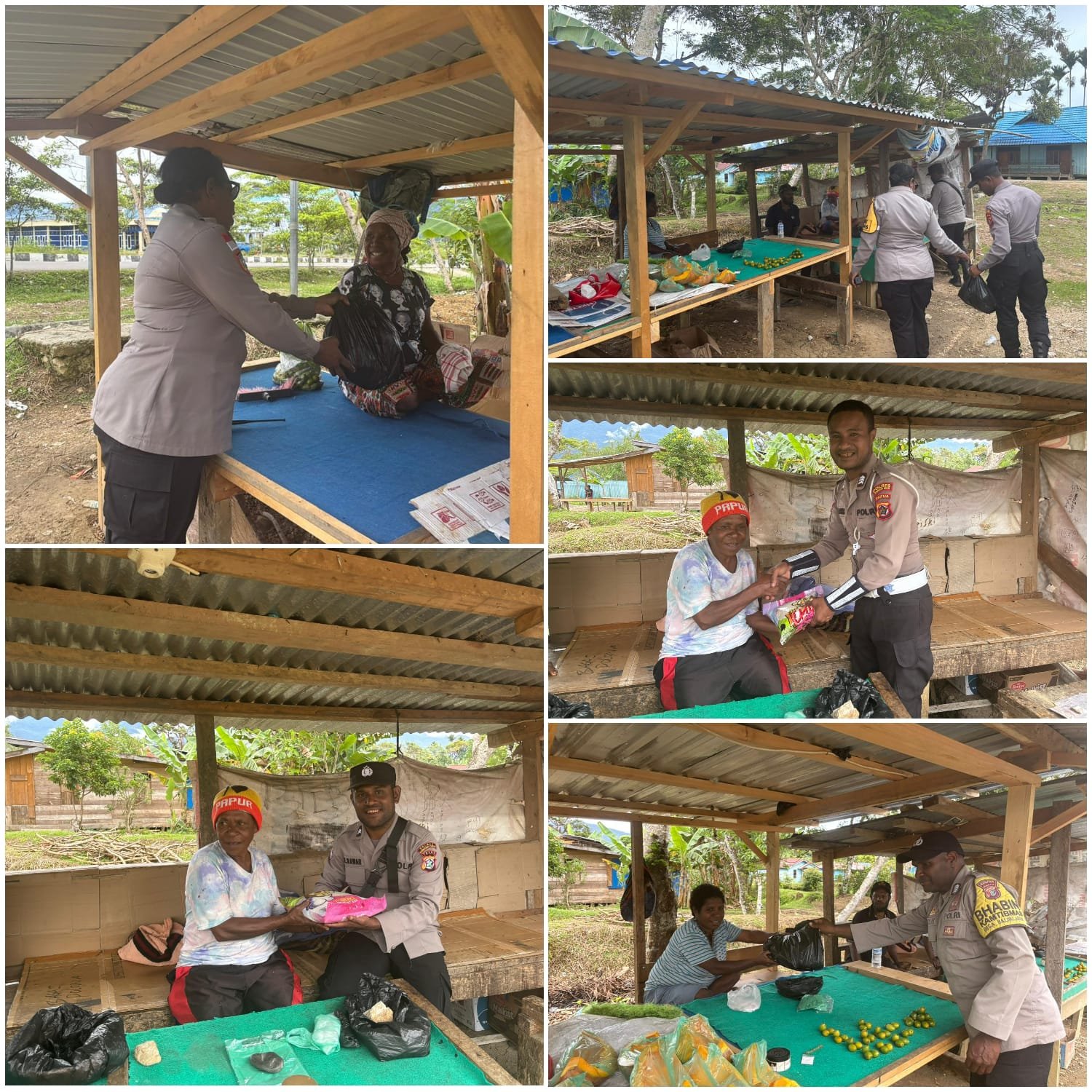 Mamteng – Satuan Binmas Polres Mamberamo Tengah menyalurkan bantuan sosial berupa sembako kepada mama-mama penjual pinang di depan Bank Papua, Kampung Kobakma 1, Distrik Kobakma, Selasa (3/3/2026).