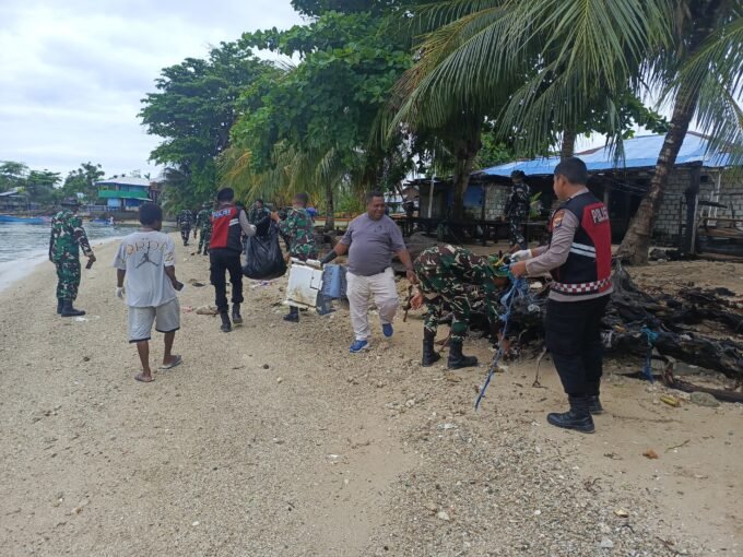 Jaga Kelestarian Alam, Polres Sarmi Bersama TNI Gelar Karya Bakti di Pantai Doro